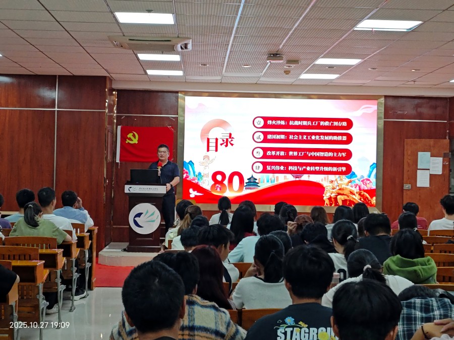 2025年10月27日晚,材料学院陈金伟院长在南区2号楼220报告厅为25级精细化工专业本科学生、高分子专业专科学生及入党积极分子讲授思政第一课,以“救亡图存—工业化奠基—制造升级—民族复兴”为脉络,展现职业教育与国家命运的深度绑定。
